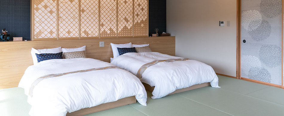 二間続きの広々客室に、セミダブルベッド2台を設えた、足を伸ばしてゆったりとした時間を過ごせる和洋室と