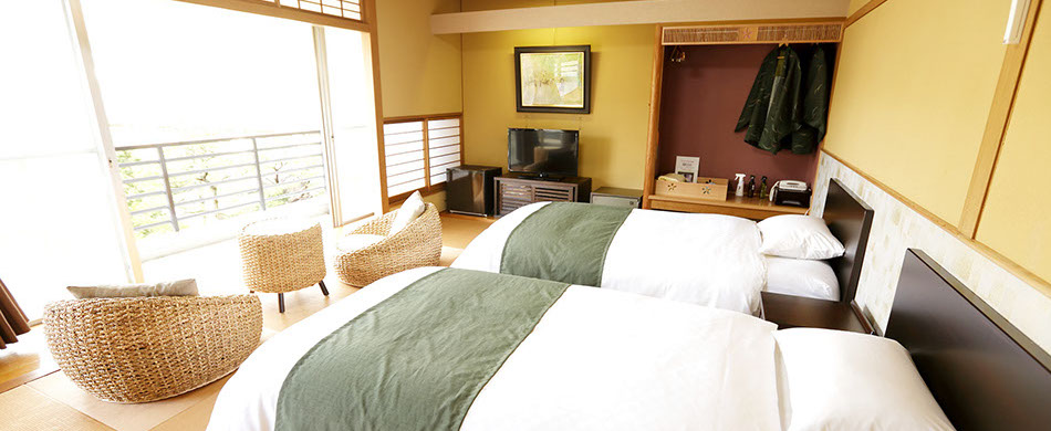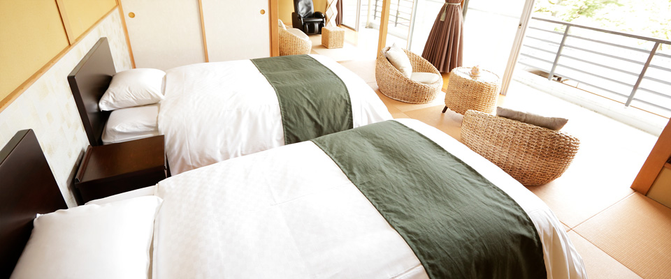 本館の角部屋に位置する当館最高眺望のお部屋にセミダブルベッド2台を設えた、和モダン客室。