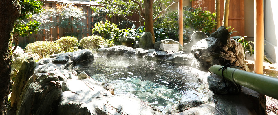 客室露天風呂は玉造温泉美肌の湯源泉掛け流し。露天風呂の他にも足湯もございます。