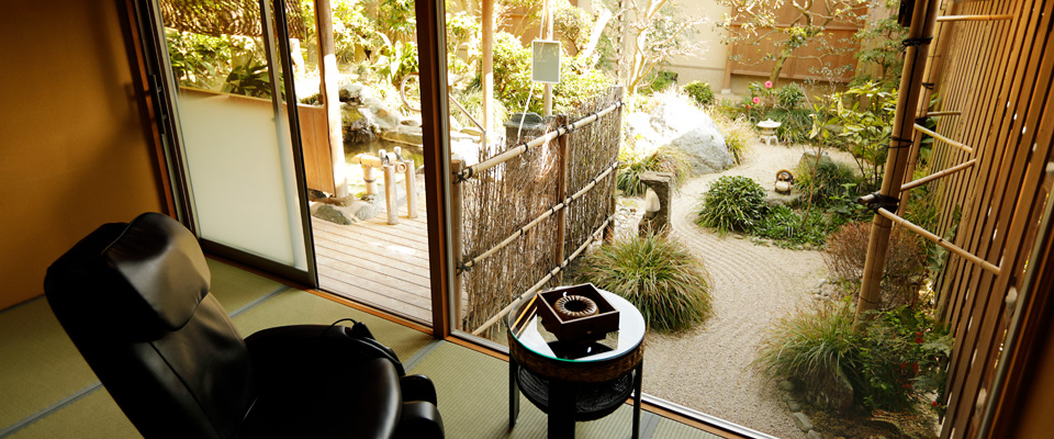 木の温もりと本い草の香りが心地よい離れ、別邸「相生」は広さおよそ一万坪、回遊式庭園の一角にございます。源泉掛け流しの専用露天風呂と、手入れの行き届いた空間で特別な時間をお過ごしください。他のお客様には出会わない、大人の隠れ家です。