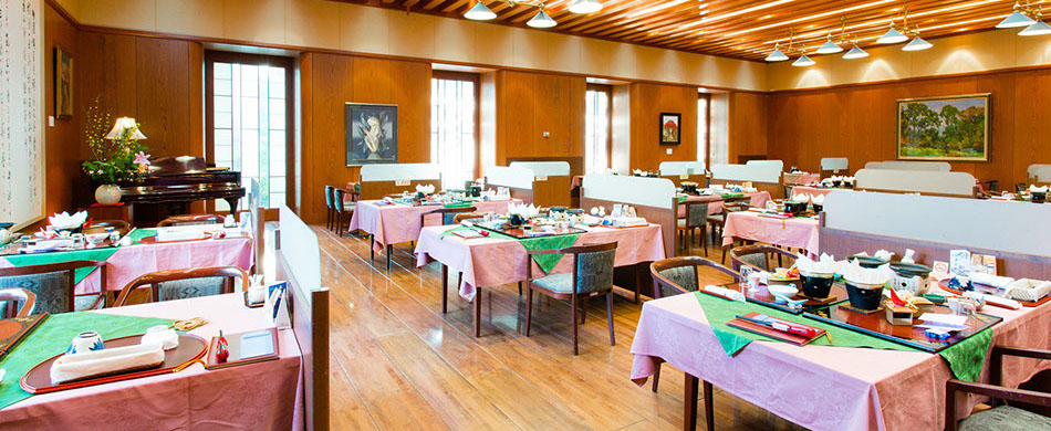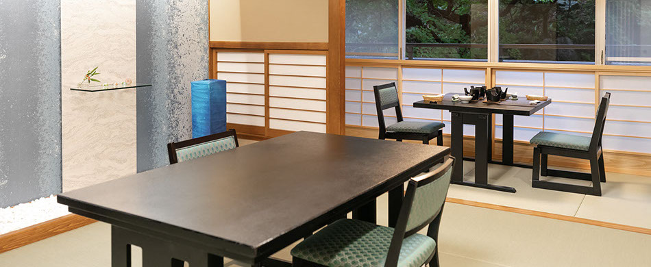 椅子テーブル席「故郷」は、広々とした空間にゆっくりとした音楽が流れるお食事会場です。