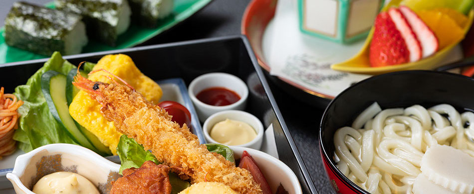オムレツ、スパゲッティ、レタス、トマト、胡瓜、海老フライ、若鳥から揚げ、ニコニコポテト、タルタルソース